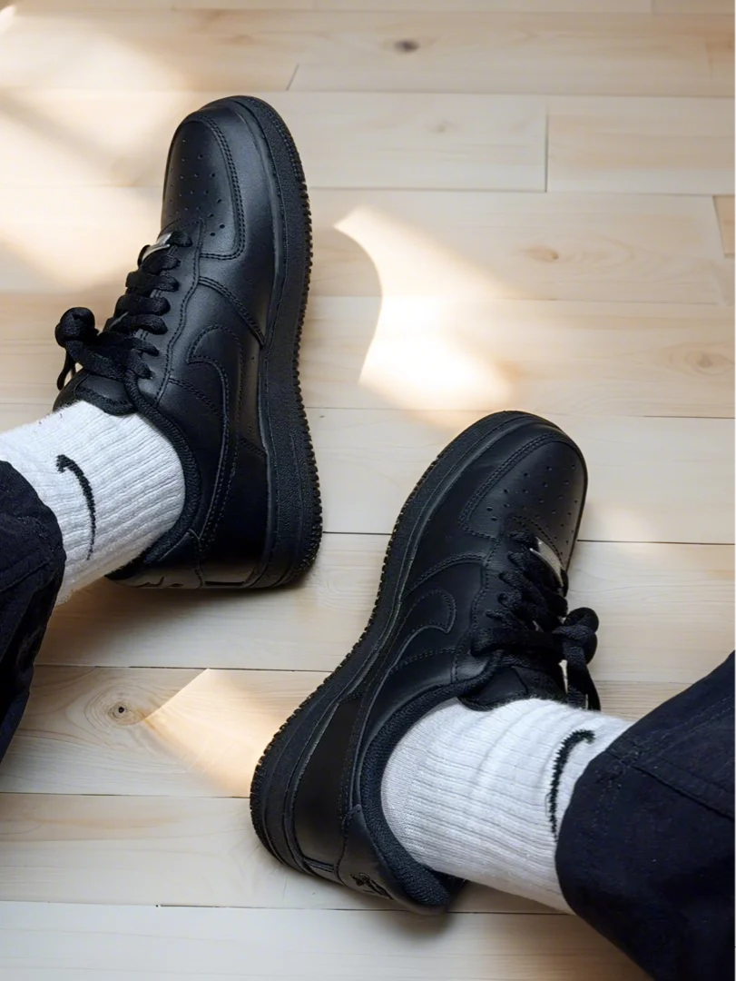 这款Air Force 1采用了全黑设计,从鞋面到鞋底,每一个细节都散发着酷感与神秘。黑色的皮革材质经过精细加工,展现出细腻的质感和光泽,搭配标志性的黑色Swoosh标志,彰显出Nike一贯的高品质与时尚感。无论是日常出街还是潮流聚会,全黑配色都能让你轻松成为焦点,展现独特的个性。