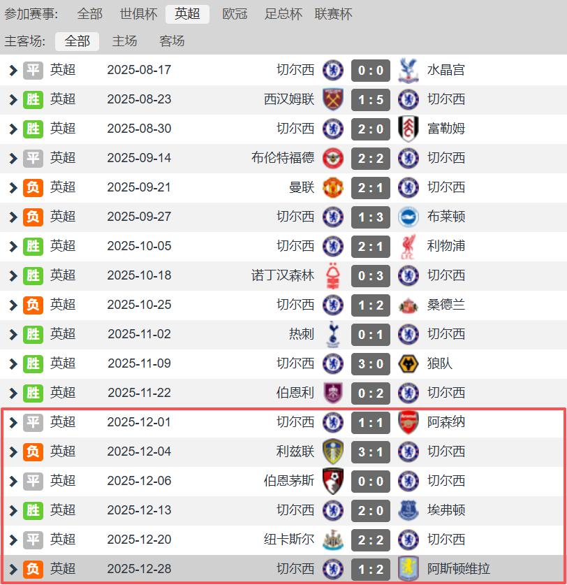 英超12轮战罢,切尔西还排名第二,仅落后榜首阿森纳6分,领先曼城1分。进入圣诞月(12月),切尔西的英超联赛成绩是遭遇了滑铁卢,近6轮英超联赛仅取得1胜,具体战绩为1胜3平3负,这让切尔西英超排名下跌至第五,与第六名曼联同分,还落后低谷时期的利物浦3分,近期战况真是惨不忍睹。
