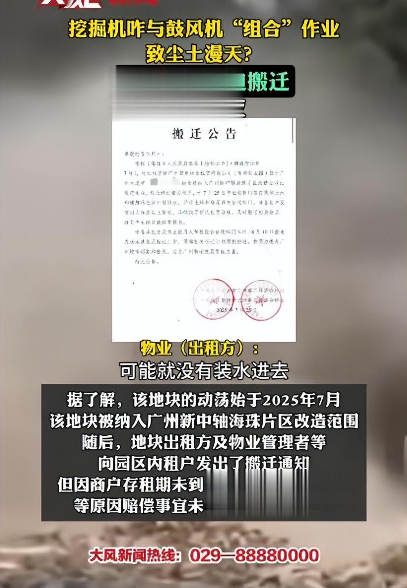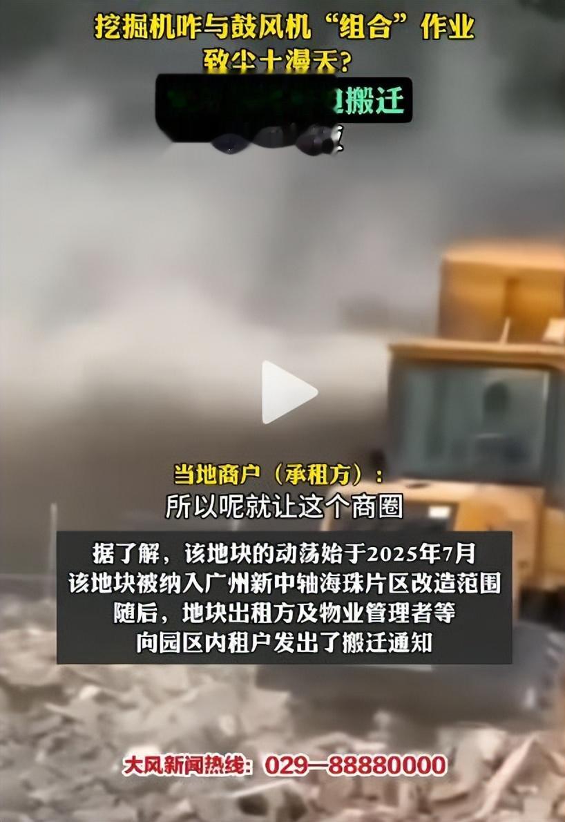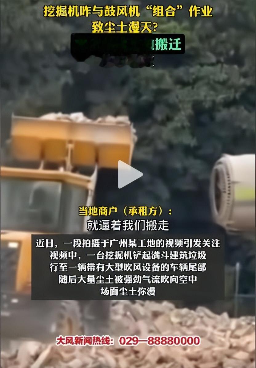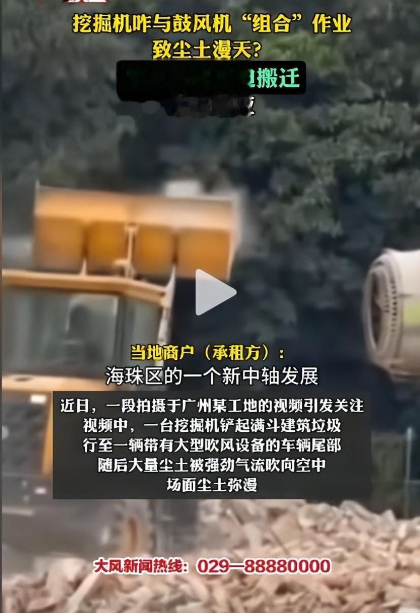 广州一工地挖掘机鼓风机“联手”制造扬尘,尘土蔽日!商户质疑借尘逼迁,物业竟称洒水车没水