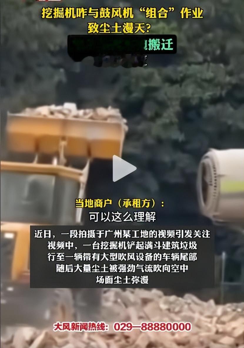 视频传上网的时候,大家都以为是恶搞。可一查地点,居然就在广州闹市区——南洲北路那边的二手车城。据网友爆料,那天挖掘机正干得热火朝天,旁边一辆装着鼓风机的车尾一对准铲斗,灰尘就像被点燃的烟花一样炸开。那场面,用网友的话说,“连空气都能嚼出颗粒感”。