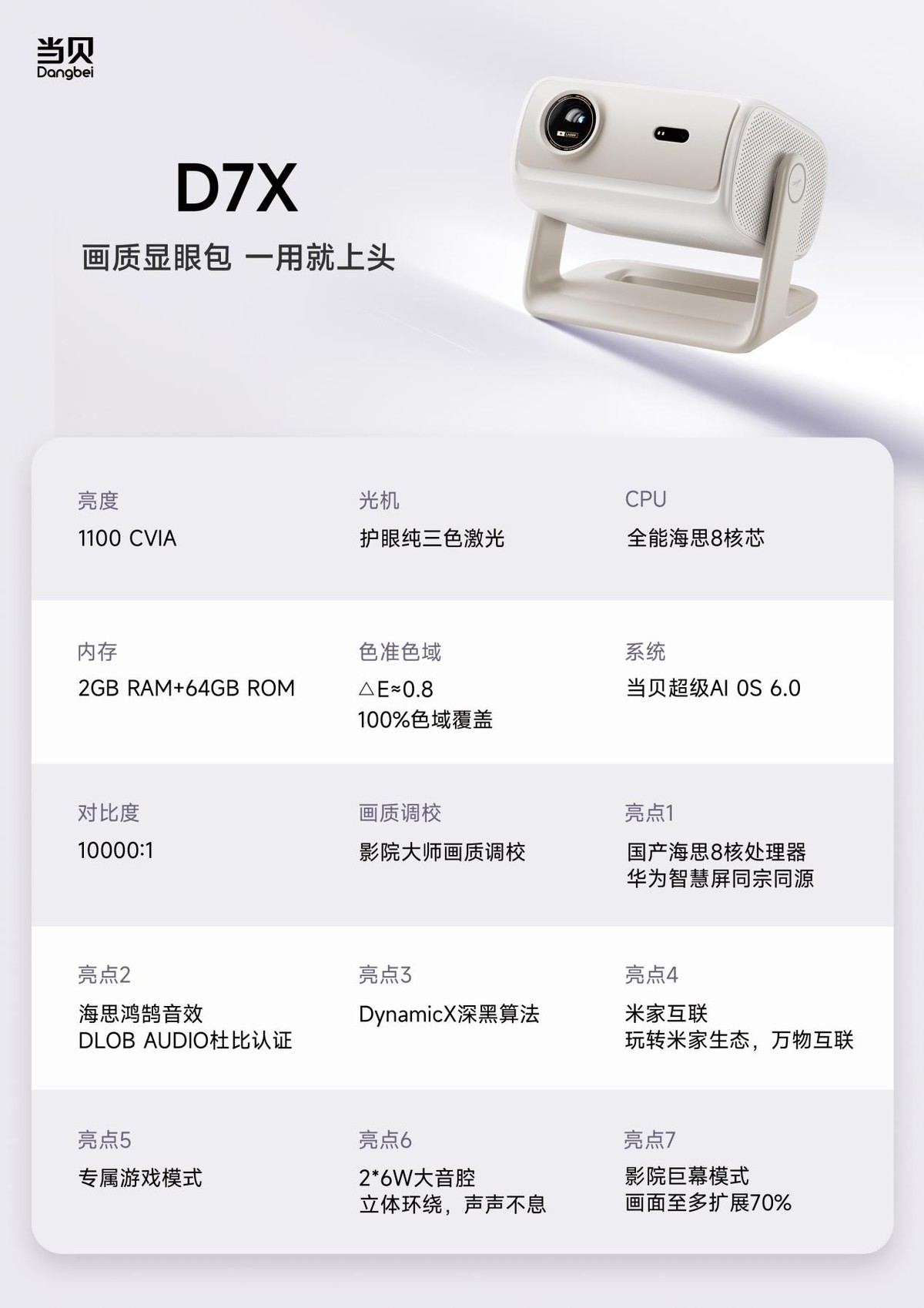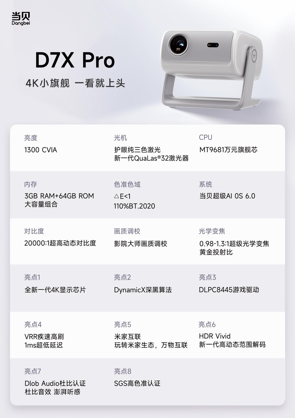 3000元档的当贝D7X Pro是“入门4K投影”,画质表现远超同级:20000:1超高动态对比度配合自研DynamicX深黑算法,搭载万元旗舰同款MT9681芯片,配合3GB+64GB超大存储,4K解码、多应用切换流畅无卡顿,存储容量较同价位机型翻倍。