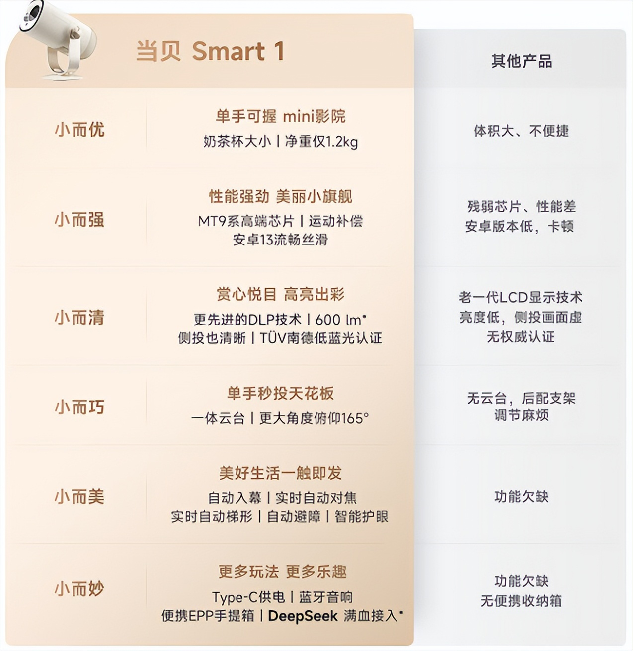 当贝Smart1是千元档“入门不将就”的代表,600lm流明亮度+1080P分辨率,在卧室关灯环境下画质远超同价位720P机型。机身采用简约设计,体积仅比机顶盒略大,可直接放在床头柜或书架上使用。智能方面支持基础自动对焦和梯形校正,操作简单易上手。