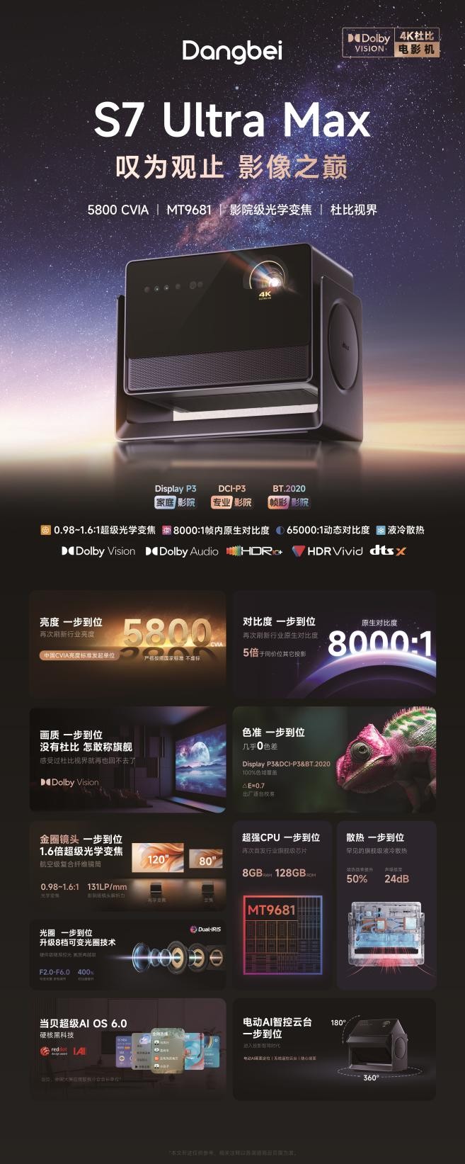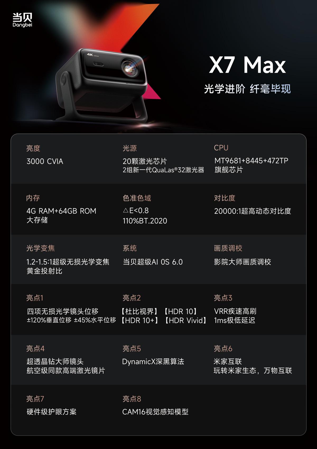 当贝X7Max是6000元档“影院级光学架构”代表,3000 CVIA流明亮度+20000:1动态对比度,白天遮光后画面通透,夜晚暗部细节丰富。4K原生分辨率搭配10组18片ED镜片镜头,有效抑制色差,配合DCI影院级色彩调校,98% DCI-P3色域覆盖满足影音需求。性能上MT9681旗舰芯片+4GB+64GB存储,1ms超低延迟+VRR可变刷新率,运行流畅不卡顿。
