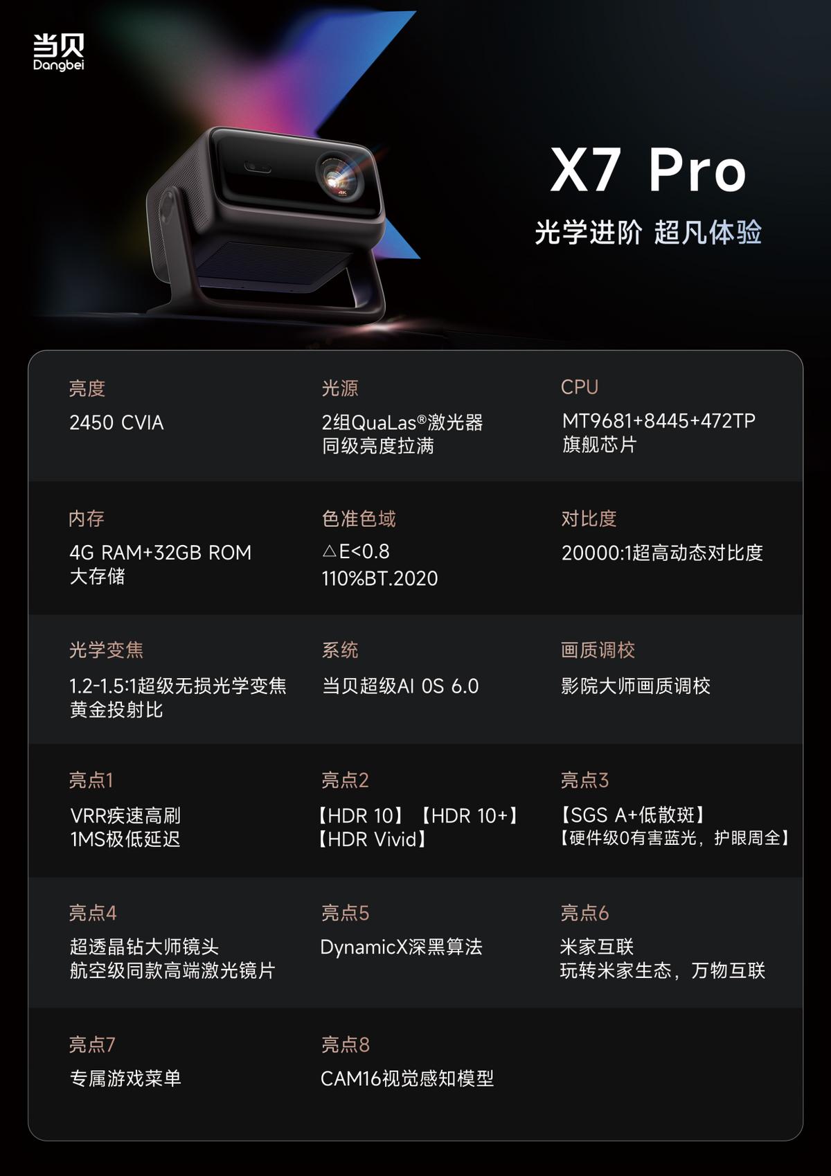 8000元档的当贝X7 Ultra是“旗舰配置下放”的典范,主打“全天候清晰观影”体验。3800 CVIA流明亮度搭配Qualas32三色激光器,白天观影无需依赖抗光幕布,暗场表现更惊艳——20000:1高对比度让暗场电影中黑暗深邃纯粹,暗部细节分毫毕现。4K分辨率配合超透晶钻大师镜头,文字等细节清晰可辨,DCI影院级色彩调校让色彩还原度直逼专业设备。