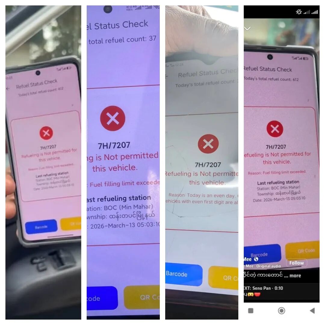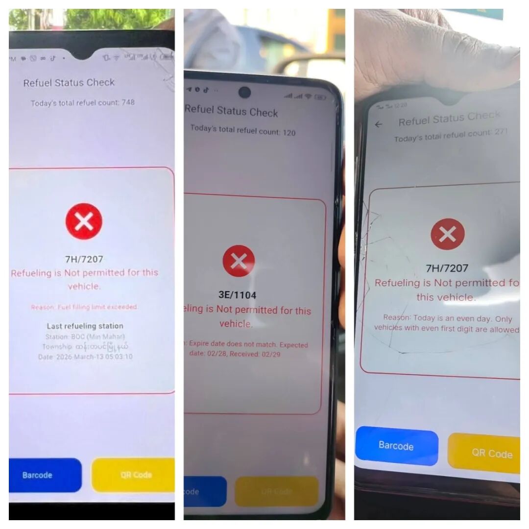 居住在仰光导欧格拉巴镇区的一名男子告诉媒体,3月13日早上他前往加油站加油时,因行车证的条形码无法扫描,接连换了3家加油站都完全无法读取,最终未能加到油。