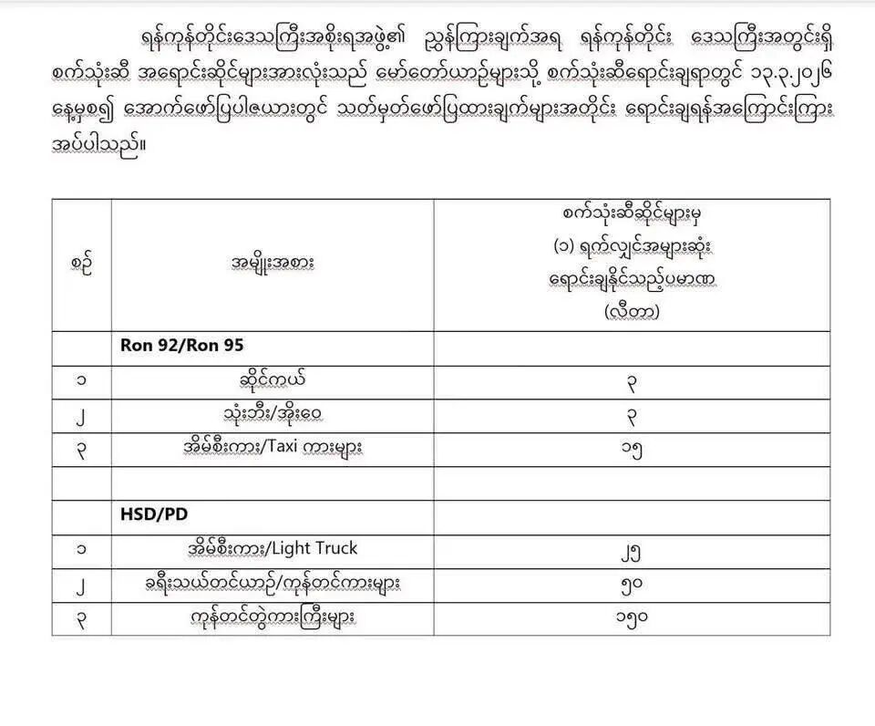 3月13日的燃油参考价中,92号汽油每升2830缅币(涨305缅币),95号汽油每升2930缅币(涨335缅币),优质柴油每升3560缅币(涨655缅币),柴油每升3205缅币(涨595缅币)。