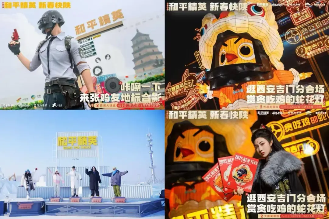 今年春节,《和平精英》与陕旅集团合作的西安芙蓉园新春灯会、大雁塔打卡点、华清宫互动大屏都挤满玩家。而位于哈尔滨冰雪大世界的《和平精英》地铁暴富乐园,在上海举办的《和平精英》神装应援趴体等活动也吸引了许多玩家参与。