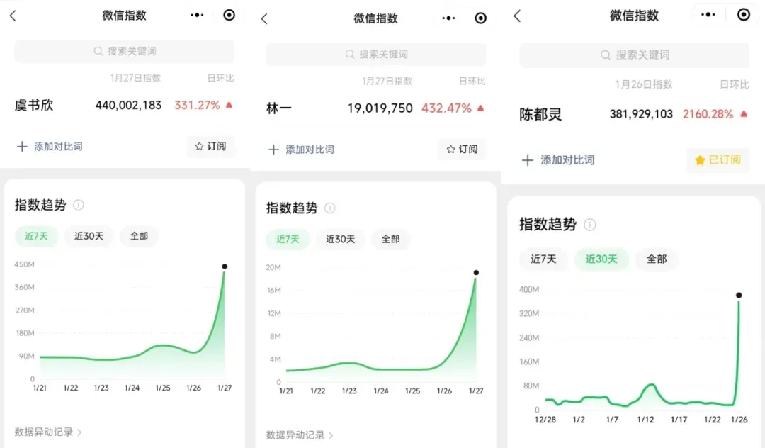 这一合作不但将神装皮肤融入传统文化的蛇年生肖主题生动地演绎了出来,也成功唤起了各位明星粉丝对游戏的关注。虞书欣、林一的CP粉就第一时间赶到评论区大呼磕到了。明星们的微信搜索指数也迎来一波猛涨,实现了与游戏的双赢。