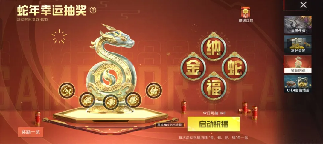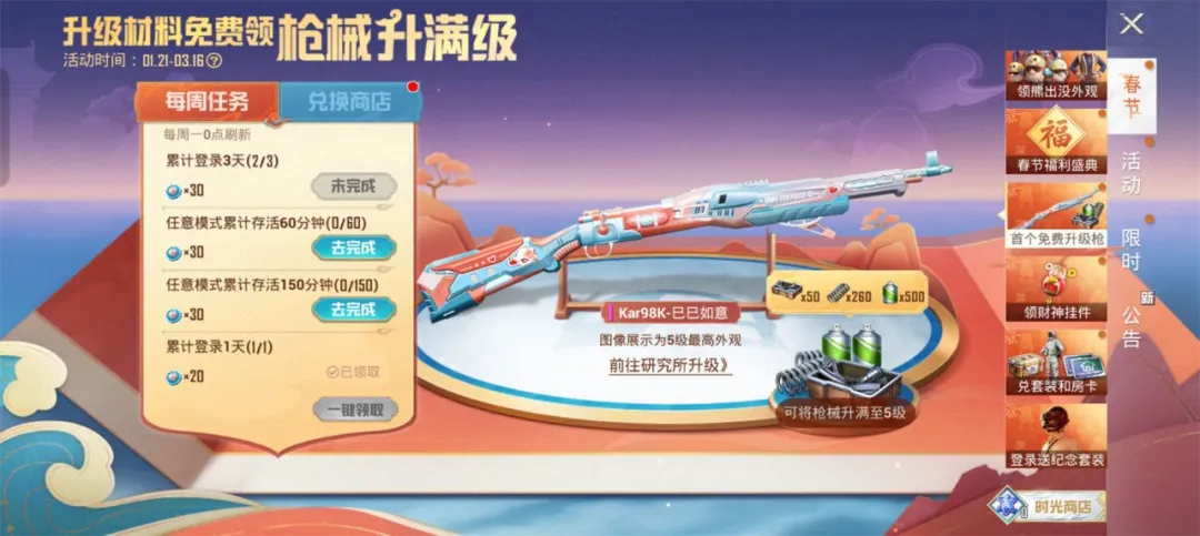 这些上线就能获取的福利活动既能唤起老玩家的情怀回忆,也能让春节刚进入游戏的新玩家快速上手。比如,升级枪“Kar98K-巳巳如意(1级)”不仅可以免费领取,在领取之后还能通过完成每日任务免费升至5级。这一设计不但给了玩家游戏目标,也让玩家可以马上拥有称手装备追上大部队,起到了很好的唤起用户活跃的作用。