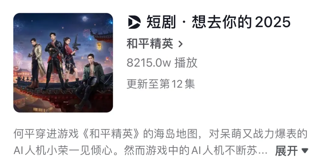 另一边,由王子奇、加奈那主演的《和平精英》首部贺岁短片《想去你的2025》在2月2日上线之后也迅速实现出圈,目前单平台播放量已破8000万。