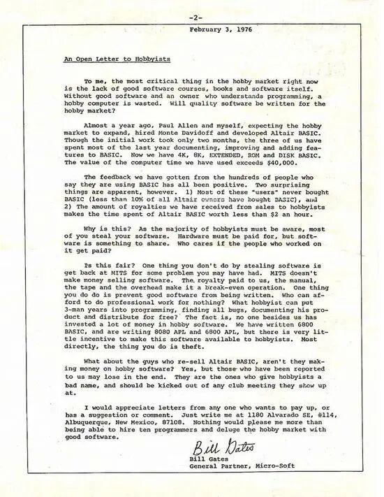 然而,事情很快急转直下。1976 年,从哈佛辍学创业的比尔·盖茨,察觉到自己公司软件的销量异常,便撰写了一封著名的《致爱好者的公开信》。信中的核心观点是:软件应当被视为一种商品,用户需要付费购买;其源代码则是软件的核心知识产权,理应受到著作权保护并被保密。