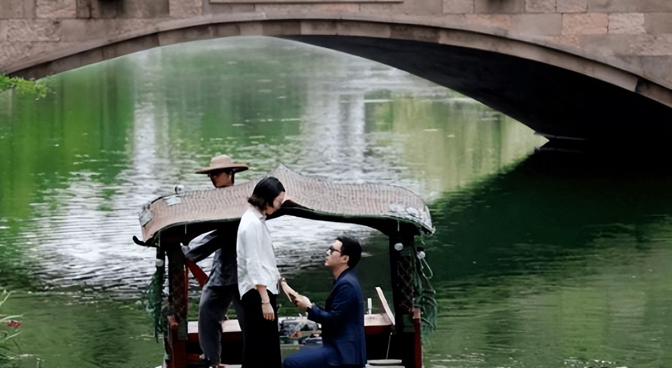 两人泛舟湖上,周围环境静谧美好,霍启仁单膝跪地,深情地为她戴上钻戒。