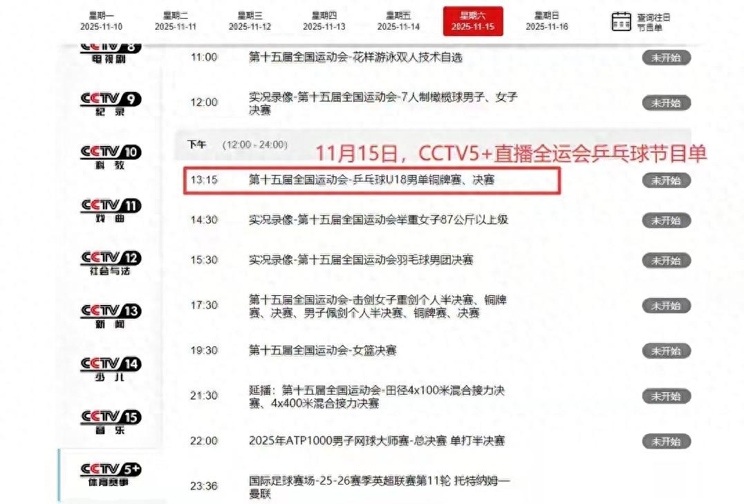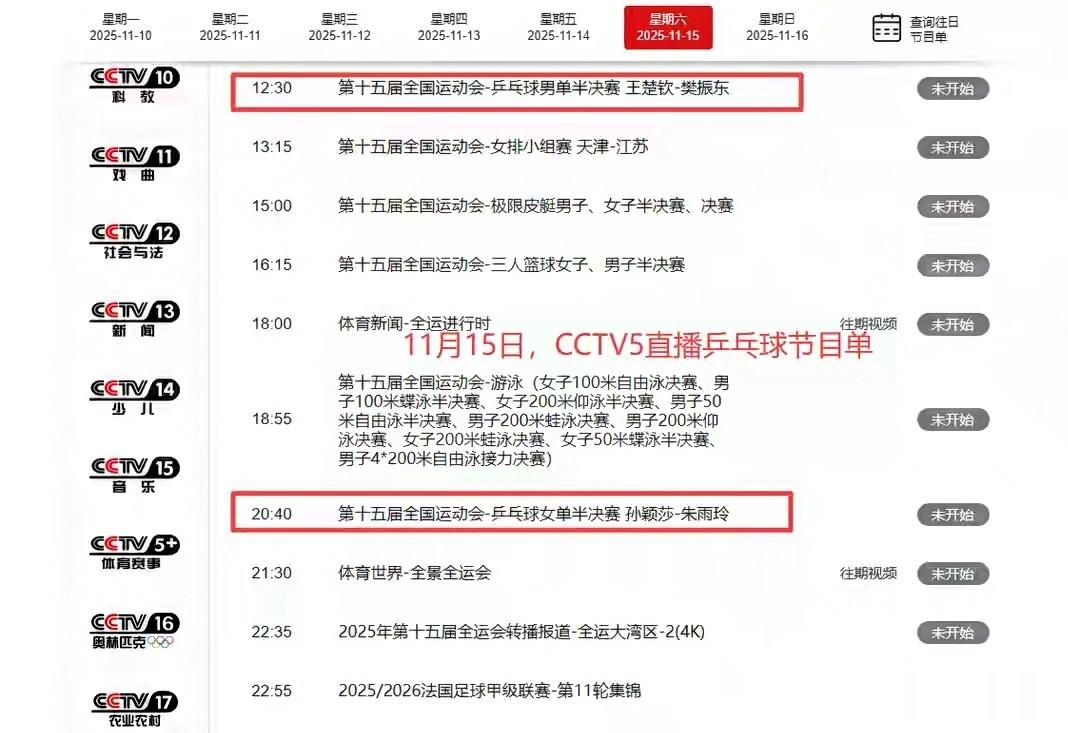 北京时间11月15日,第十五届全运会乒乓球赛场进入单打金牌的冲刺阶段,中央广播电视总台的直播计划也随之进行战略性调整。