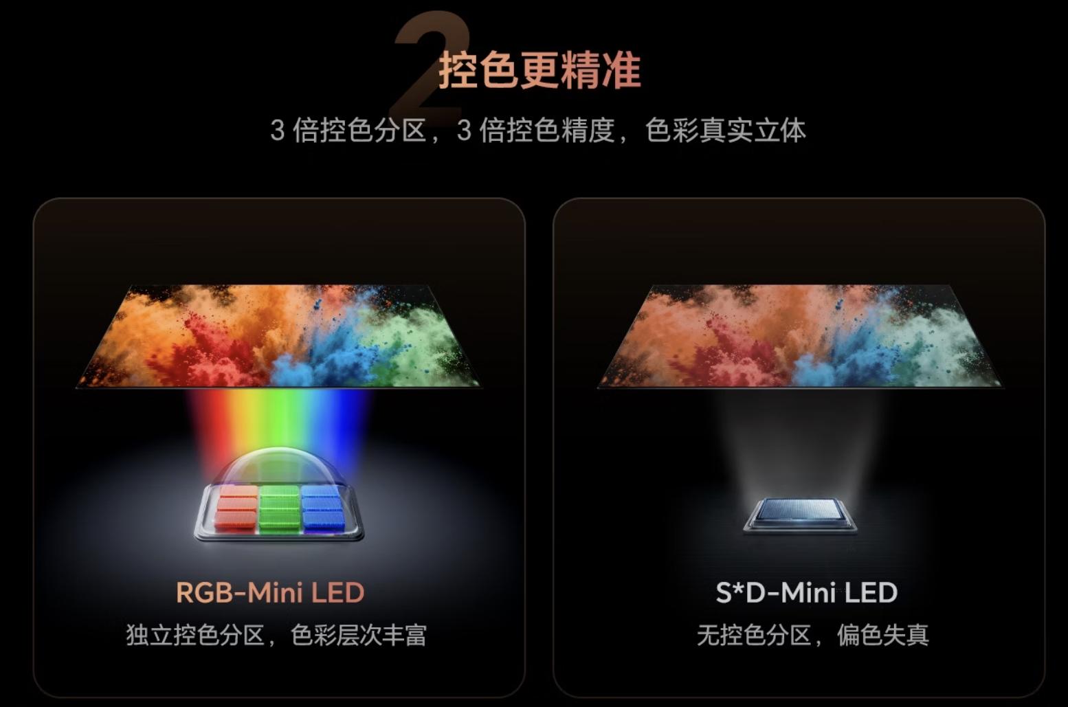 而RGB-MiniLED走的是彻底革新路线:不要量子点,不要高色阻滤片,直接让红、绿、蓝三色发光芯片独立直出。这就好比画家直接用三原色颜料调色,而不是先挤一堆白色再费力“激发+过滤”出彩色——色彩纯净度从源头拉满,转换损失与串扰问题被物理级规避,是显示技术上的一次质的飞跃。
