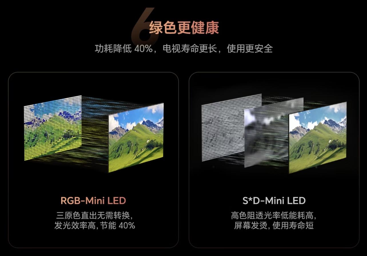 SQD为弥补透光率损失,背光亮度不仅大,而且功耗较高且需要长期处于高电流高发热状态,也大大影响了量子点材料的寿命。而RGB-Mini LED三原色直出,无需滤光片牺牲光效,同等亮度下显示效率更高,因此相比QD-OLED节能40%。同时,低功耗=低温升=元器件寿命大幅延长,更耐用也更放心。