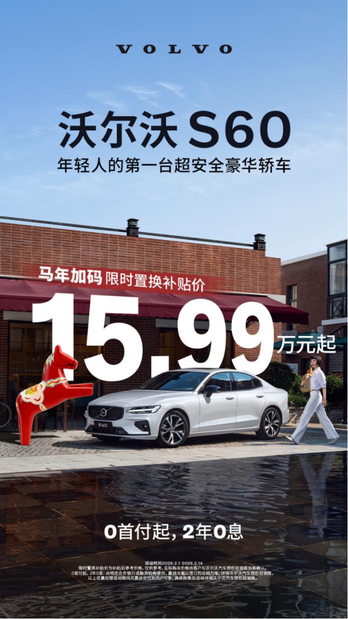 在豪华中型车阵营,出自北欧豪华代表沃尔沃之手的S60,凭借安全以及性价比的优势,深受诸多消费者的青睐。值得一提的地方在于,随着新年的到来,沃尔沃S60为了让更多用户体验到高品质豪华轿车的魅力,推出了限时补贴政策,从2026年2月1号开始,一直到2026年2月28号,即可享受15.99万起的限时置换补贴价,并且还有0首付起,2年0息等在内的政策,结合豪华品牌出品,中型车的定位身份,可见其诚意之高。