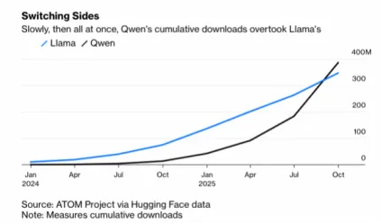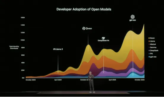 黄仁勋更是在10月GTC大会上展示的图表赤裸裸地揭示真相:2025年开源模型下载量中,阿里千问占据绝对主导,并且领先优势还在以每月12%的速度扩大。