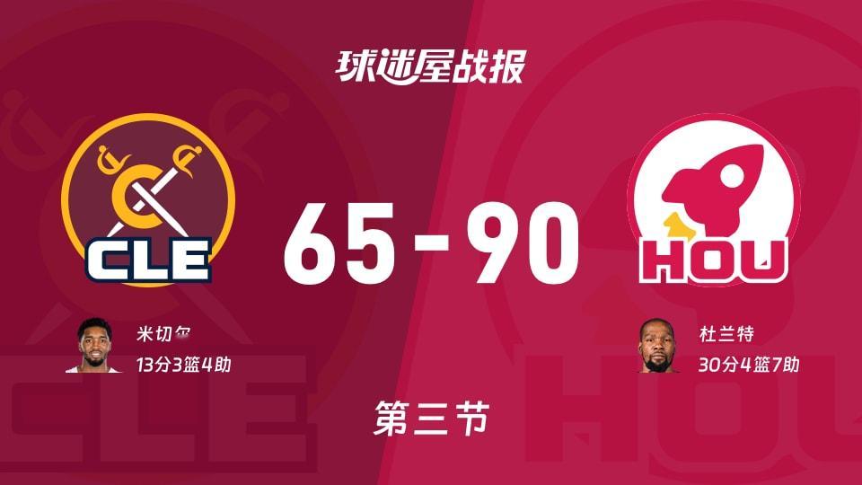 下半场回来,骑士率先拿到2分,比分来到60-48,就当以为客队要展开反击的时候,场上风云突变。史密斯、伊森、亚当斯连续得分,比分瞬间来到48-66。第三节后半段,杜兰特连拿7分,个人得分来到30分。本节结束时,火箭90-65,领先骑士25分,貌似比赛已经失去悬念了,第三节比分为30-17。