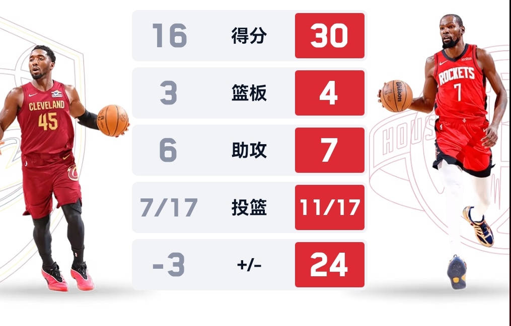 比赛临近结束,杜兰特手感依然火热,连得五分,两队分差来到16分。半场战罢,火箭60-46领先骑士14分。