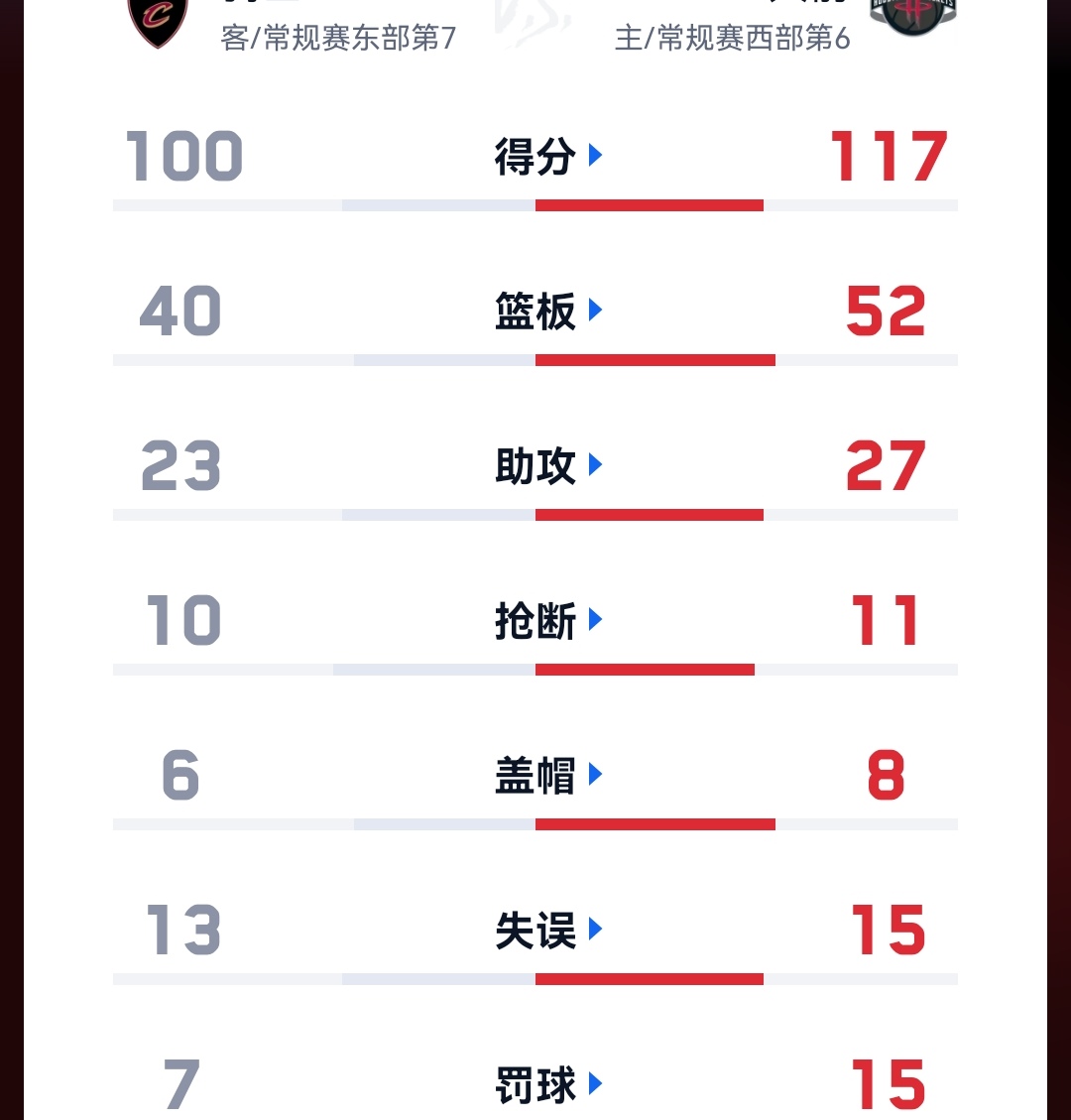 比赛最后几分钟,双方都上了替补球员,最终火箭117-100大胜骑士。自己取得两连胜的同时也完成了对骑士的5连胜。