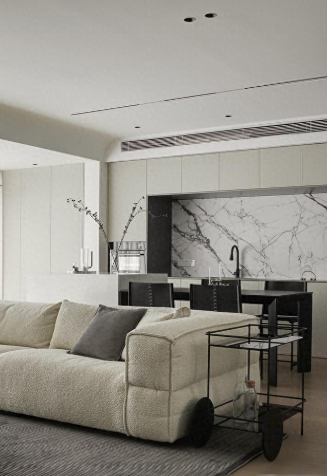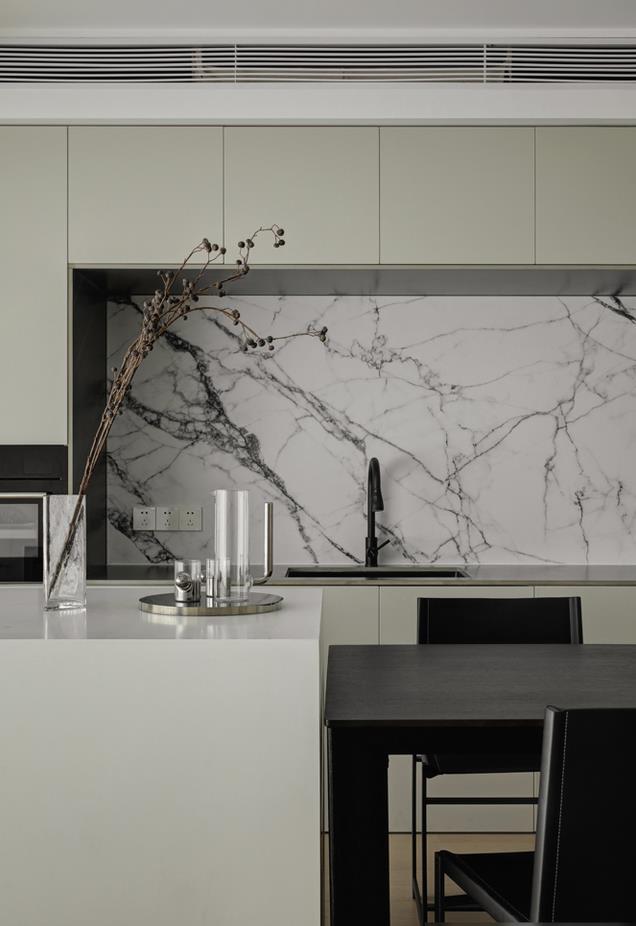 而客餐厅区域本身就是建筑师为空间量身定制的一款区域,我们不仅没有去改动它们之间承重墙的一部分,甚至还为它们量身定制了镂空的餐边柜和操作岛,在使空间不会显得压抑局促和给人过于繁芜感受同时,也将整个空间变得更加优雅格调。
