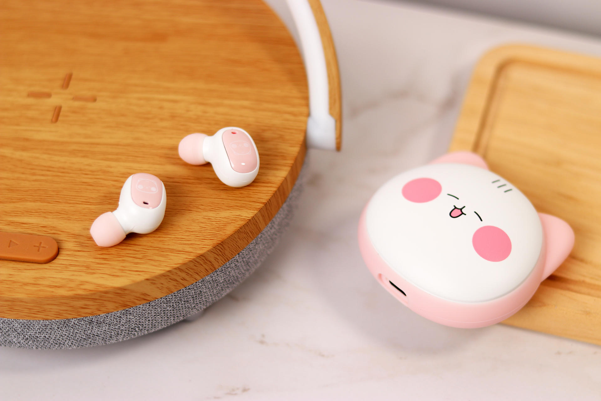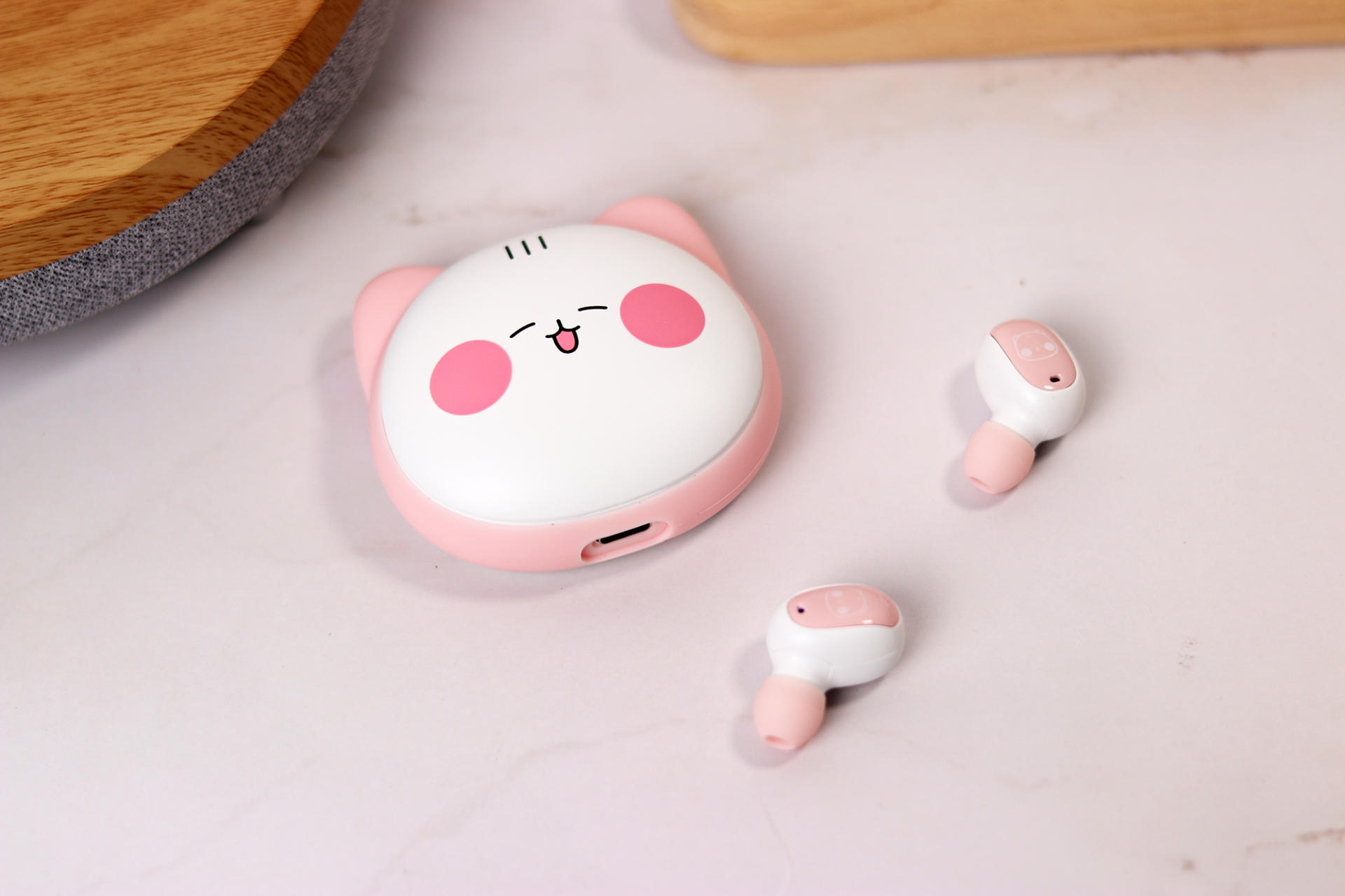 耳机整体超级小巧轻松,打开盖子就能看到两个入耳式的小耳机。因为体积很小,所以佩戴起来也很舒服。