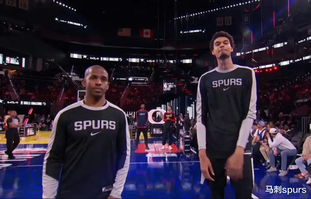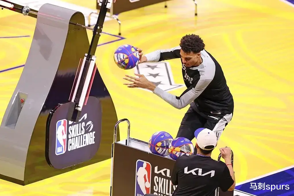 一开始,一切都像往常一样平平无奇地展开,直到马刺俩哥们上场。先是文班,在投三分环节明显漫不经心,没有用正常的投篮动作,只是将球甩出,最后一颗球做做样子砸到篮筐上,大家开始意识到,这小子这是为了节约时间啊。