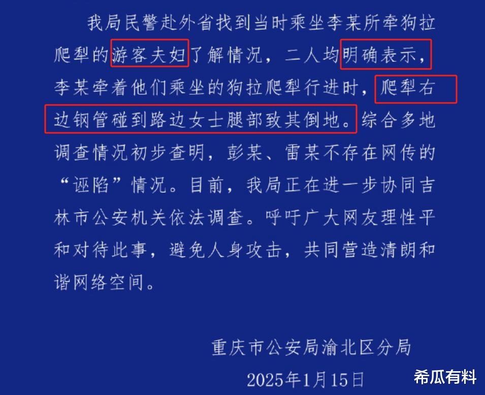 通报最关键的一点,有事发时乘坐吉林大爷狗拉爬犁的游客夫妇,非常明确的表示,重庆大妈是被爬犁右侧的钢管碰倒的!