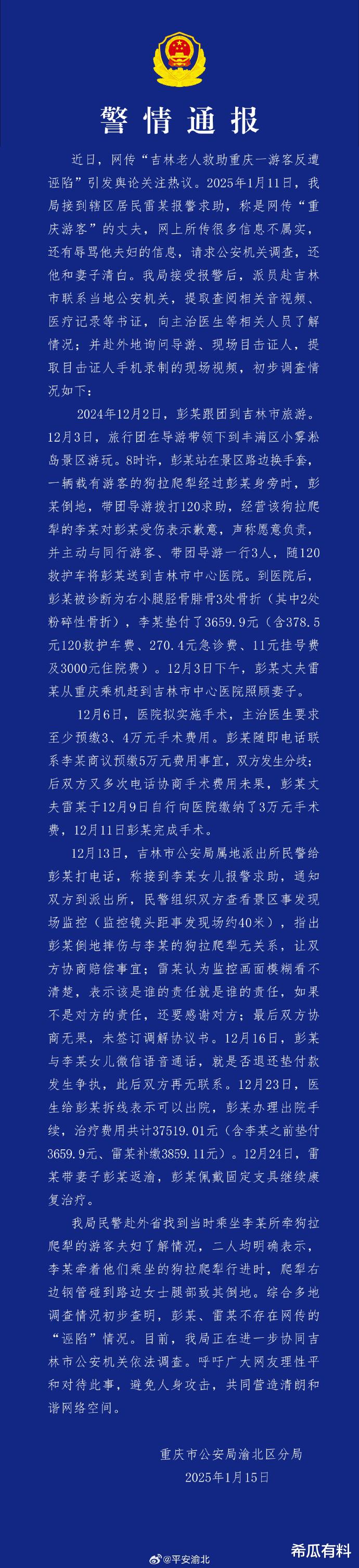 另外,重庆大妈的伤情是小腿胫骨腓骨3处骨折,有2处还是粉碎性骨折,在吉林医院治疗费用共计37519.01元,返回重庆后还在康复治疗阶段。后续吉林大爷应该对重庆大妈进行相关的赔付。