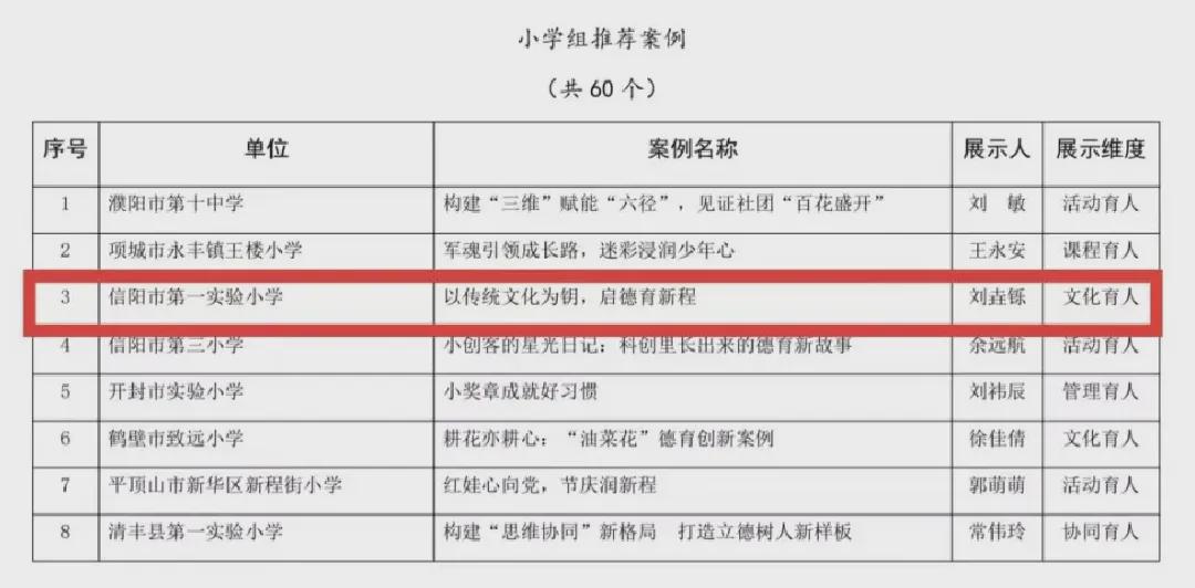 此次获奖不仅是对该校德育创新实践的肯定,更为后续工作指明了方向。信阳市第一实验小学相关负责人表示,未来学校将继续深耕传统文化沃土,进一步探索构建科学系统的传统文化德育课程体系,以此次获奖为新起点,持续深化德育创新,走出一条兼具文化底蕴与时代特色的育人之路,让传统文化在校园中绽放更绚丽的光彩。(石洋洋 刘垚铄)