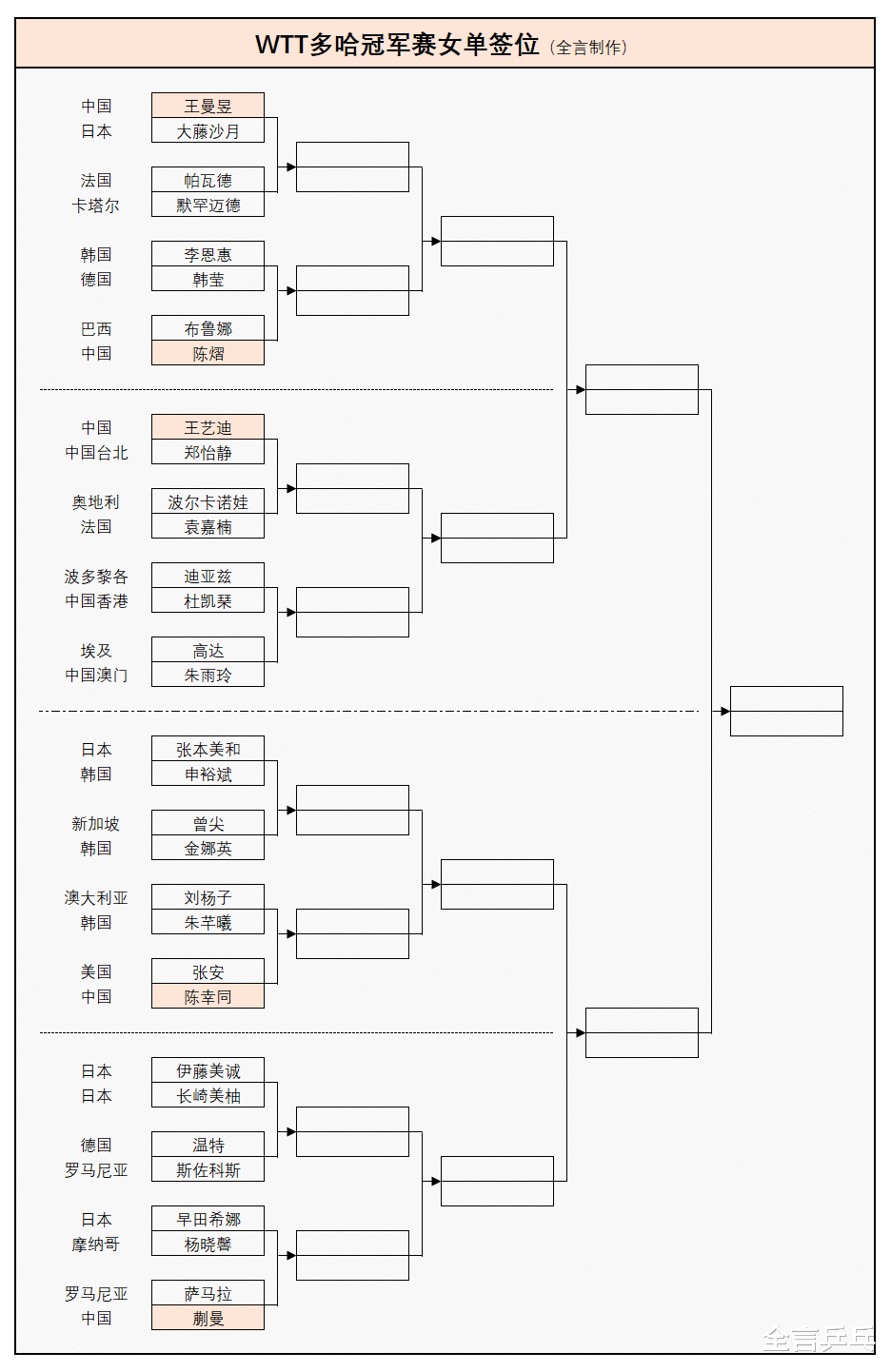 WTT多哈冠军赛:女单签位公布!王曼昱首轮抗日,国乒有希望包揽4强
