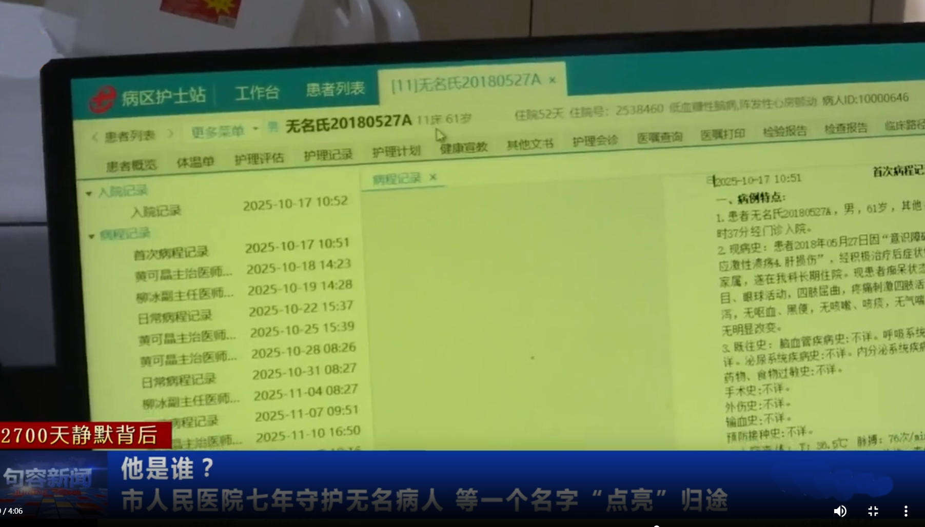 七年“无名”人生:一场生命的静默守望在江苏句容市人民医院神经内科的病房里,时间仿佛被按下了暂停键。病床上的他,被医护人员称为“无名”。