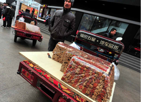 若是碰上一个讲究的摊主,要在里面加入更多的干果,那么这个切糕的价值可就不低了。因此,两百元的切糕,并不是什么稀罕的事情。