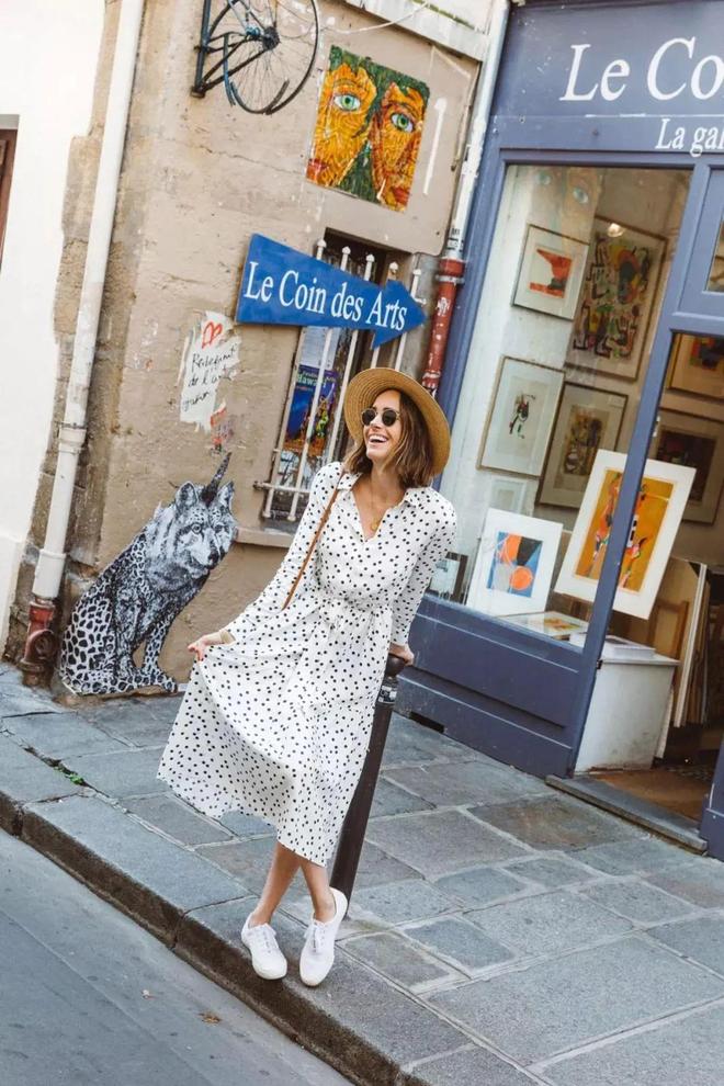 拥有复古与法式风情的波点裙,搭配布质款的小白鞋,不仅显脚小,正式中加了一分休闲,实力演出毫不费力的时髦。