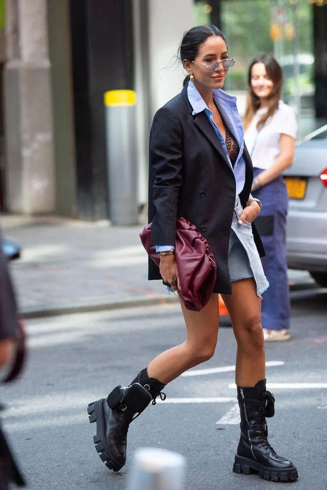 一条百搭的mini牛仔裙,搭配厚重的机车靴,西装一披,一下子slay全场!