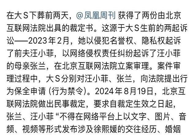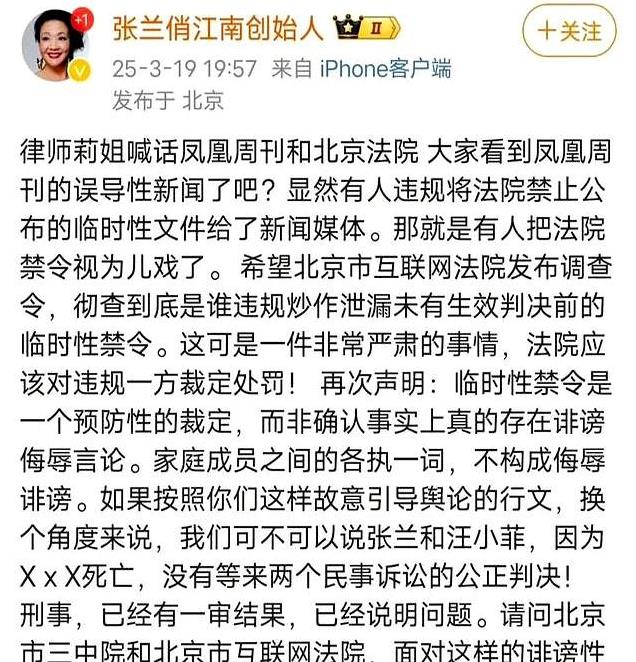 话说凤凰周刊发了一篇文章,说法院给汪小菲和张兰下了个“禁言令”,不许他们公开谈论大S的事儿。这下可捅了马蜂窝,张兰直接炸了,在网上质问:这法院内部文件,怎么就跑到媒体手里了?谁泄的密?张兰这脾气,圈里人都知道,风风火火,直来直去。她觉得有人故意搞她,把个临时禁令说成最终判决,带节奏,想让她和汪小菲背黑锅。想想也是,这几年,张兰和S家,那真是针尖对麦芒,从生活费到床垫,再到电费,鸡毛蒜皮的事儿都能吵上天。张兰觉得自己委屈,明明是受害者,却被说成“恶婆婆”。这回的“禁言令”,在她看来,又是有人故意给她扣帽子。