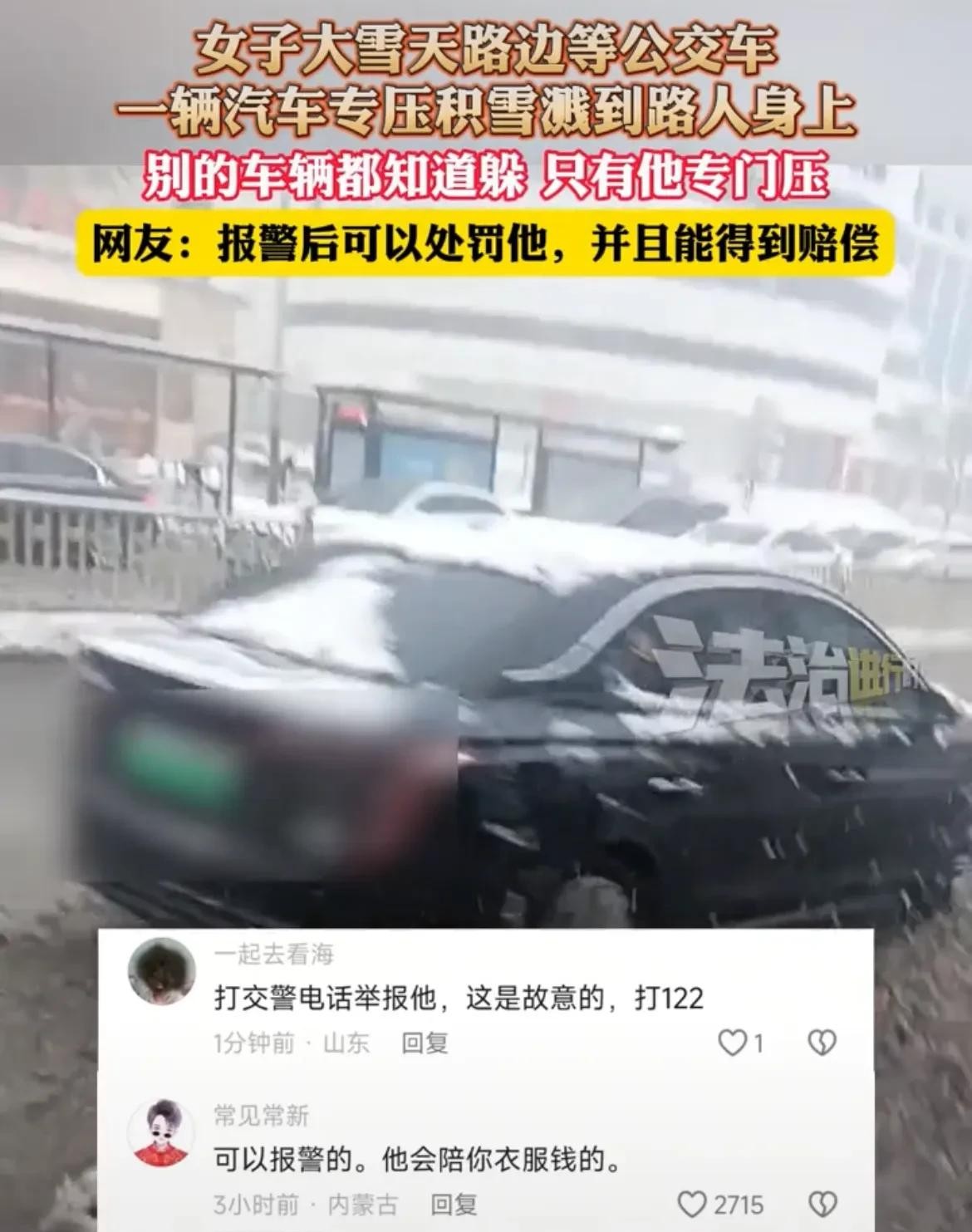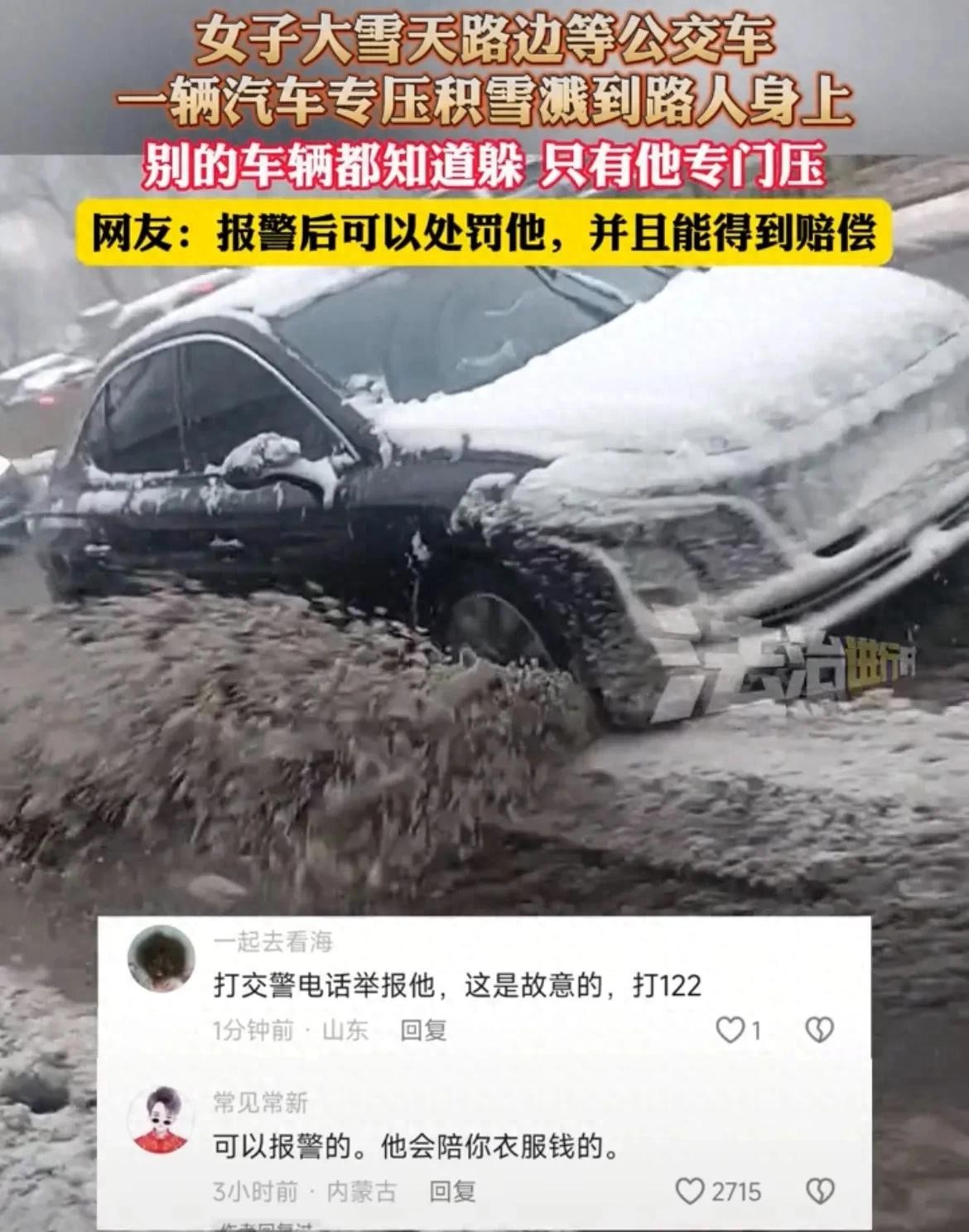 只见,一辆黑色的小轿车从远处驶来,丝毫没有减速或变道避让这条厚厚的积雪,更加没有顾及公交车站台上等车的市民,朝着它快速压过去,瞬间溅起数米高泥水。