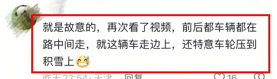 就是故意的,再次看了视频,前后都车辆都在路中间走,就这辆车走边上,还特意车轮压到积雪上!