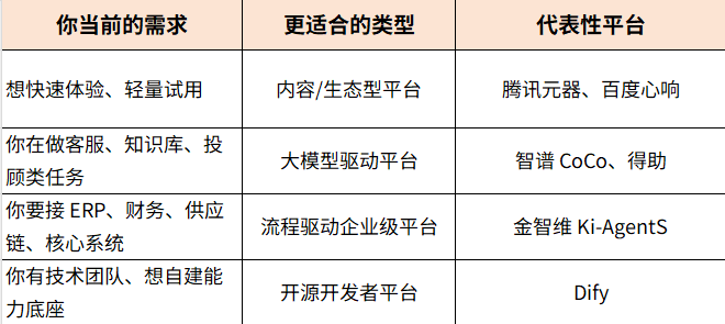 平台这么多,究竟哪一款更适合你的企业呢?这里整理了一份更易上手的判断框架,帮助企业在选择智能体时少走一些弯路: