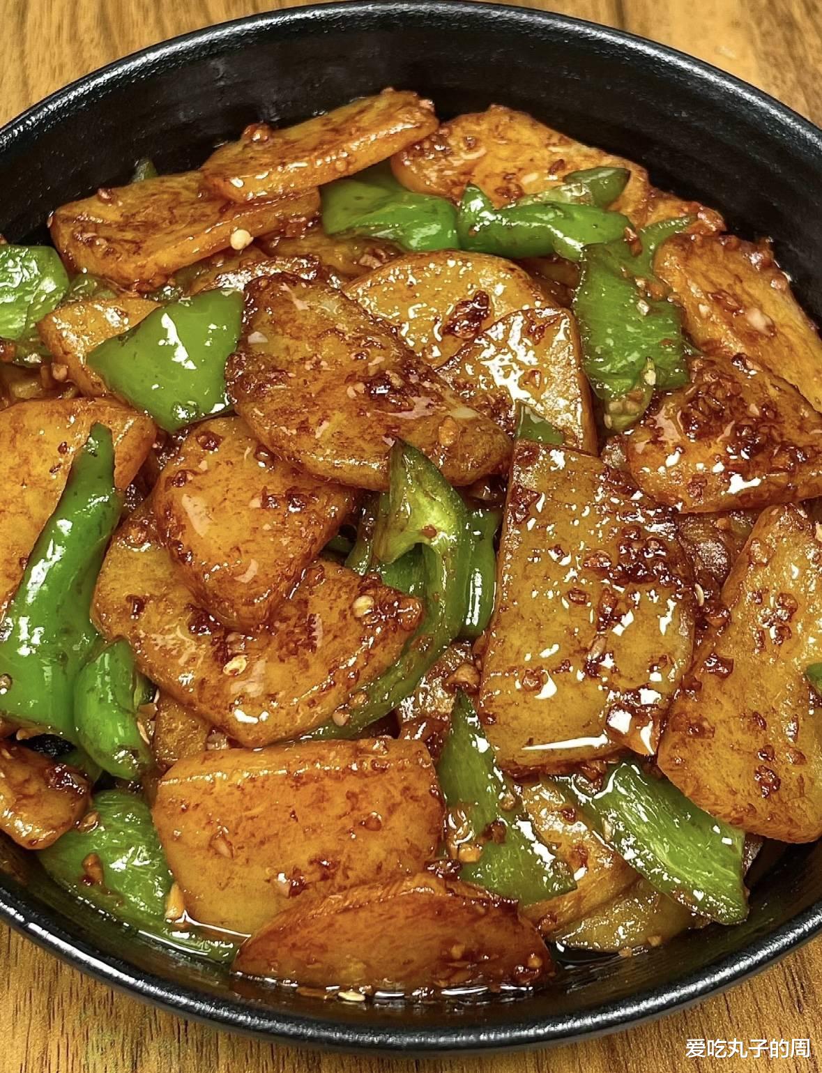步骤:1. 处理食材- 土豆去皮后切成薄片或者丝状(根据个人喜好),切好后立刻放入清水中浸泡,以去除表面的淀粉,防止氧化变黑。 青椒洗净,去蒂去籽,切成与土豆相匹配的块或丝。