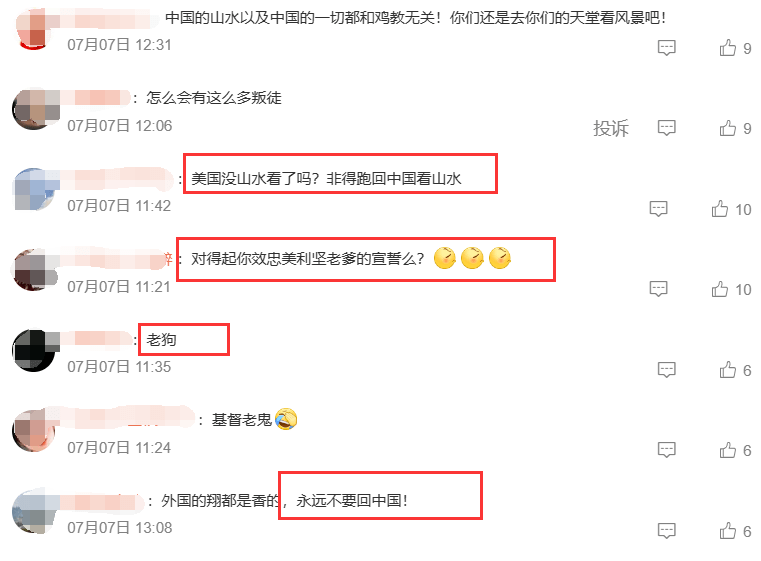 网友们看到他所谓的“乡情”后,也毫不客气的怼了回去,“美国没山水看了吗?非得跑回来看山水”、“永远不要回来”等等。