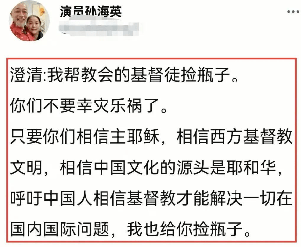 也许是看到了网友们的讽刺,孙海英急着出来辩解,说自己是在为教会捡瓶子。