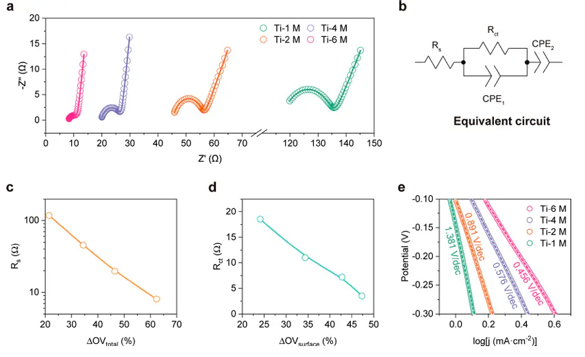 氧空位的引入通常会导致电荷传输阻抗(Rct)的降低,这在Nyquist图中表现为半圆弧半径的减小此外,氧空位有助于氧离子和电子的协同迁移,从而改善整体的离子导电性,这也可能导致。在等效电路模型中,氧空位的存在可能还会影响或赝电容的表现,进一步反映在阻抗谱的中高频区域。