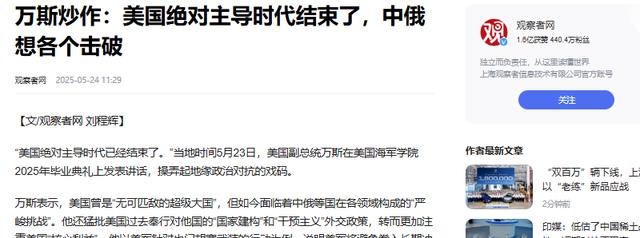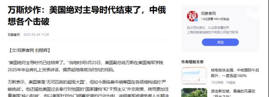 万斯炒作:美国绝对主导时代结束了,中俄想各个击破.观察者网.2025-05-24