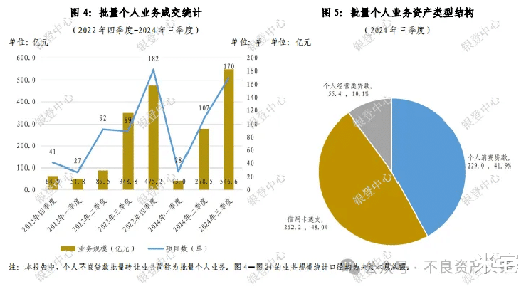 来看银登中心给的数据,2023年个人不良贷款批量转让业务成交达到了965.3亿,比上一年增长400%多,而2024年三季度比二季度又增加了70%,个人不良贷款规模处于上升的阶段。