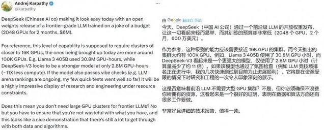 DeepSeekV3的推出可以说是东方大国在AI大模型领域一次标志性的突破,以往我们在这方面的认知基本上是“顶级模型都是国外的”,而DeepSeek的崛起表明,国产大模型已经开始发力,尤其是在成本和性能方面取得双突破。业内人士分析认为,DeepSeekV3的参数量高达671B,激活参数37B,预训练token量14.8万亿,在性能上已经不输于国外顶级模型,比如OpenAI的GPT4o和Anthropic的Claude3.5Sonnet等。