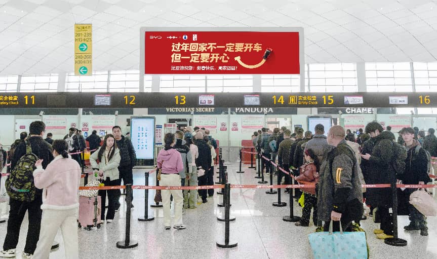 当所有品牌都在谈春运规模、里程数据、出行方案时,比亚迪却在机场与城市户外大屏上写下了一句格外不同的话——