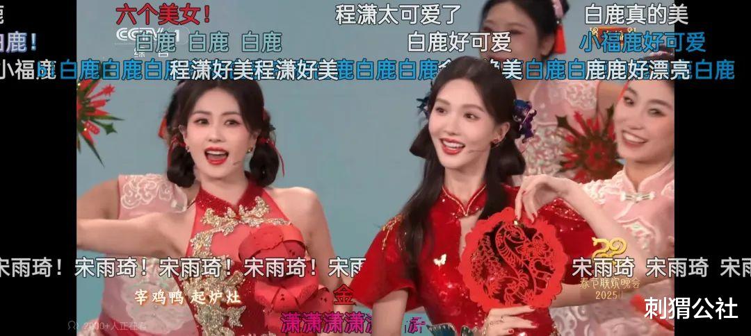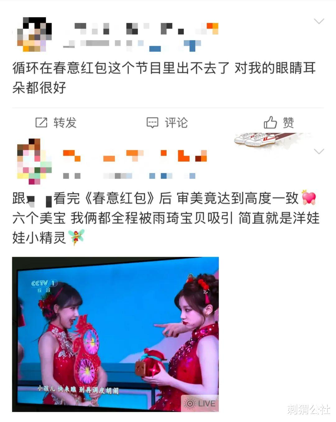 而让很多年轻观众直呼可爱又养眼的,是一档歌舞节目《春意红包》,由金晨、白鹿、毛晓彤、宋雨琦、程潇、姚晓棠六朵小花表演,喜庆温暖的新年祝福曲。春节伊始,很多人脑子里还回荡着“小麦面包饺,喜色上眉梢”的BGM,有用户留言说,“循环在春意红包里出不去了,对我的眼睛耳朵都很好。”