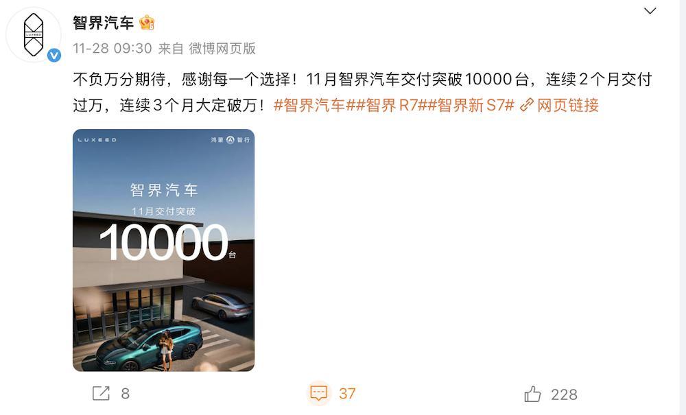 智己汽车11月份销量13,577台,同样创造品牌销量记录。