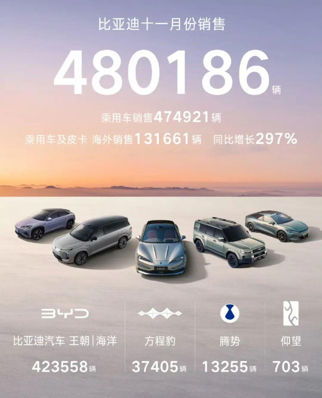 比亚迪11月份销售新车48万台,同比下降5%,环比增长9%。即便同比下降,比亚迪依然以巨大优势保持着销冠位置。在比亚迪内部,王朝海洋系列依然是核心主力,11月份销量42万台,在内部占据超过8成份额;方程豹当月销量37,405台,和蔚小理已经在同一级别;腾势销量依然平稳,当月销量13,255台;令人惋惜的是仰望,虽然比亚迪倾注了优渥资源,销量始终难以突破四位数,11月份销量只有703台。